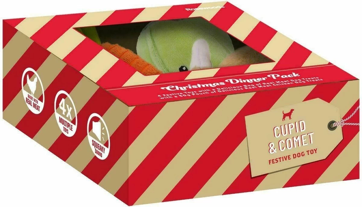 Geef jou hond of kat een leuk kerstdinerbox cadeau met de feestdagen. Deze kerstdinerbox bevat 3 leuke pluche speeltjes, 1 kerstrode frisbee en 1 zakje met snacks voor je hond.