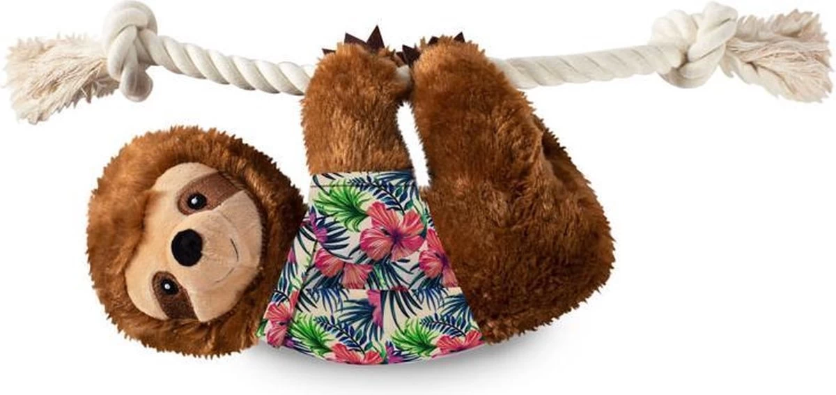Pluche Luiaard met jungle outfit aan touw. Extra luide pieper + touw. Afm. 25x46cm.