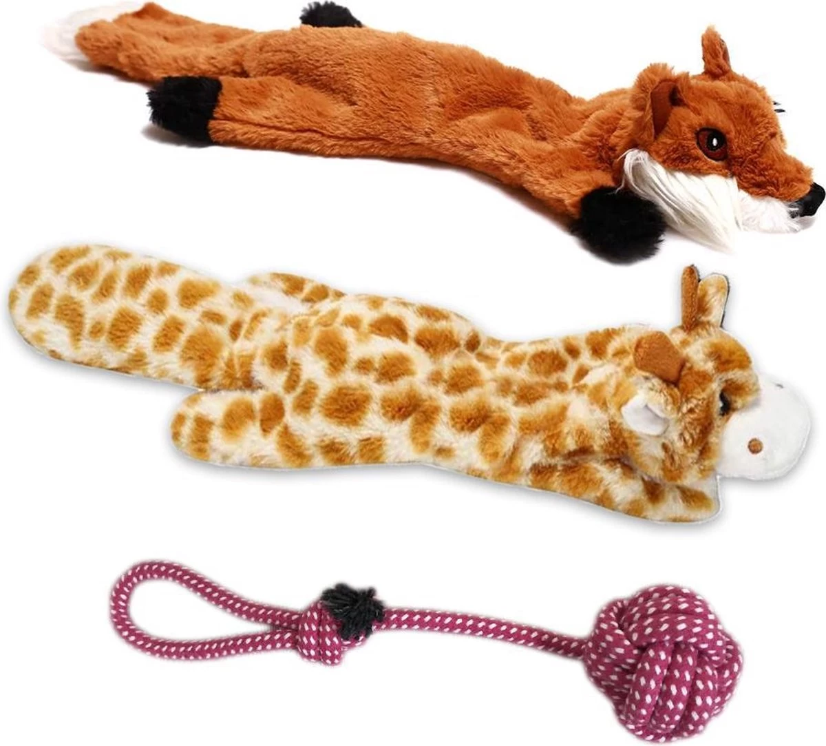 Opzoek naar het perfecte speeltje voor jouw hond zodat hij zich uren zelf kan vermaken? De pluche honden speeltjes van PORA is wat je zoekt. In een set ontvang je twee pluche beesten en een hondenspeeltouw. De pluche beesten zijn gemaakt van duurzaam sterk materiaal. In het speelgoed zit een noisemaker die bijdraagt aan ultiem vermaak. Gegarandeerd uren speel plezier met de honden speeltjes van PORA.