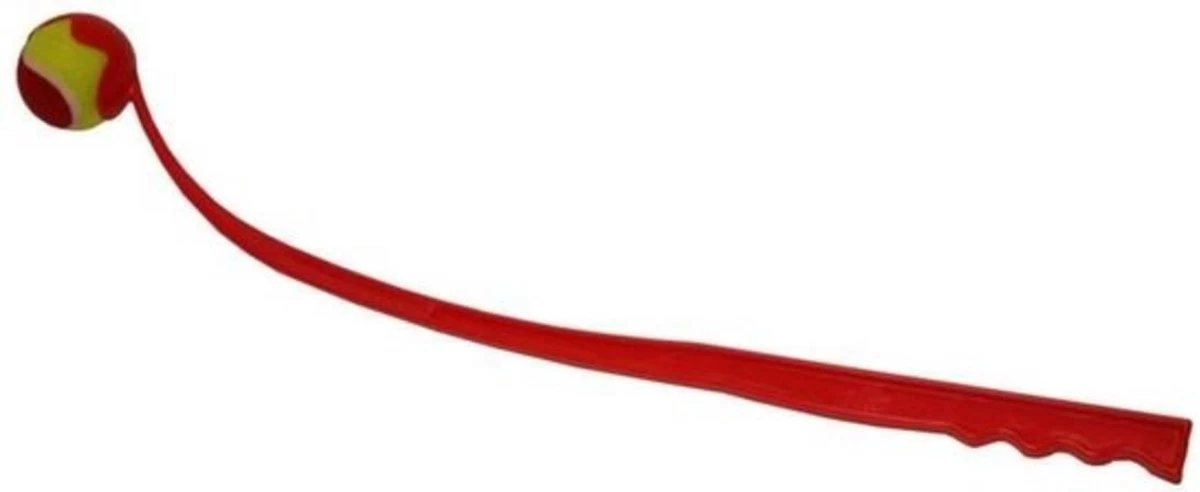 De Werpstick is 65 cm lang. Er zit één tennisbal bij het product, normale tennisballen passen ook in de werpstok.