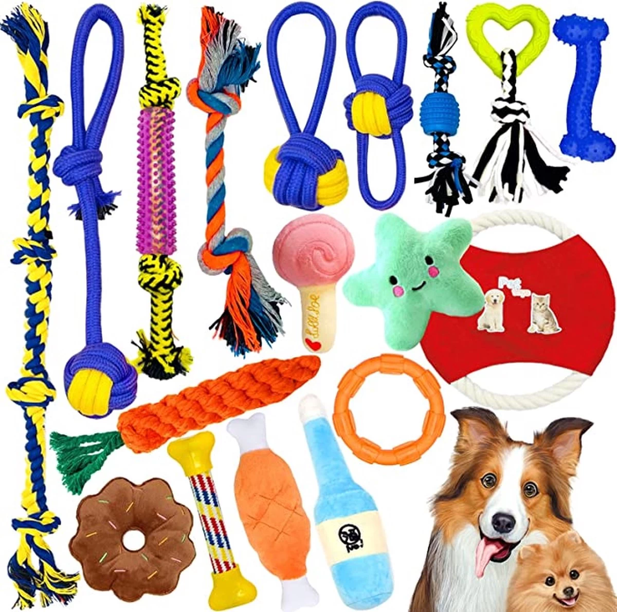 - 18-delige hondenspeelgoedset voor honden: 18-delig kauwspeelgoed voor honden, touwspeelgoed, trainingsspeelgoed, interactief speelgoed. Verschillende vormen om aan de behoeften van het kauwen van honden te voldoen, om verveling te verlichten, laat je beste vriend zich concentreren op entertainment en beweging, voorkom dat je puppy meubels kauwt.