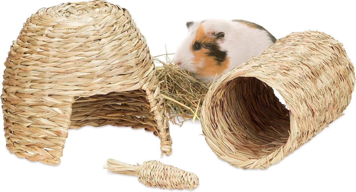 Met deze 3-delige set van knaagdier spullen kun je een mooie kooi inrichten met gevarieerde mogelijkheden om te spelen, knabbelen en verstoppen. De knagers kunnen zich bezig houden met de wortel, de tunnel van hooi en het huisje of gaan slapen in het grashuis. Het konijnenhuisje, de cavia tunnel en de stro wortel zijn volledig gemaakt van natuurlijke materialen en de diertjes kunnen er zonder problemen aan knagen.