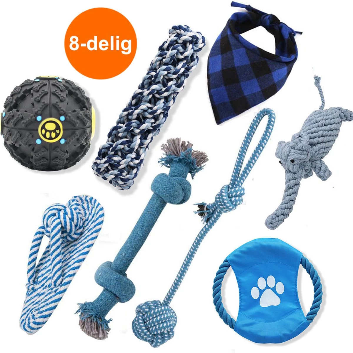 RoiPets® Honden Speelgoed Set Geschikt Voor Puppy’s t/m Middelgrote Honden – Hondenspeeltjes – 8 stuks – Honden Speelgoed Intelligentie – Voedingsbal – Honden Knuffel – Honden Bandana