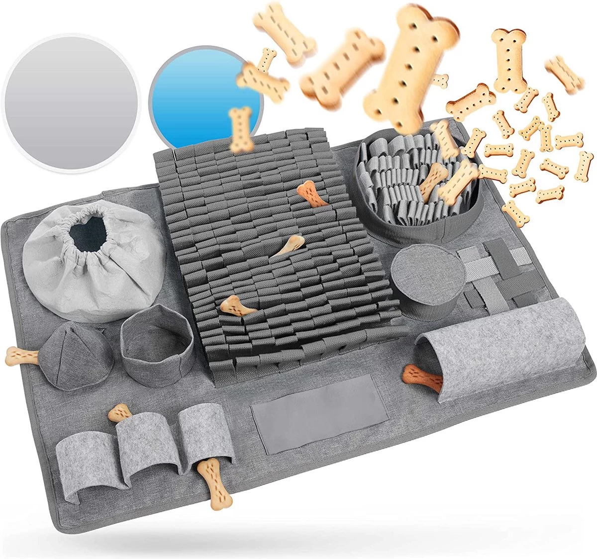 - Hondentrainingsspeelgoed: Het is een uniek trainingsspeelgoed voor honden waarbij ze snacks of kleine speeltjes kunnen vinden die verstopt zijn in de mat. Dit helpt om de reukzin van uw hond te trainen, energie kwijt te raken en gewicht te verliezen. U verstopt gewoon de favoriete snack van uw hond in een hoek van de mat.
